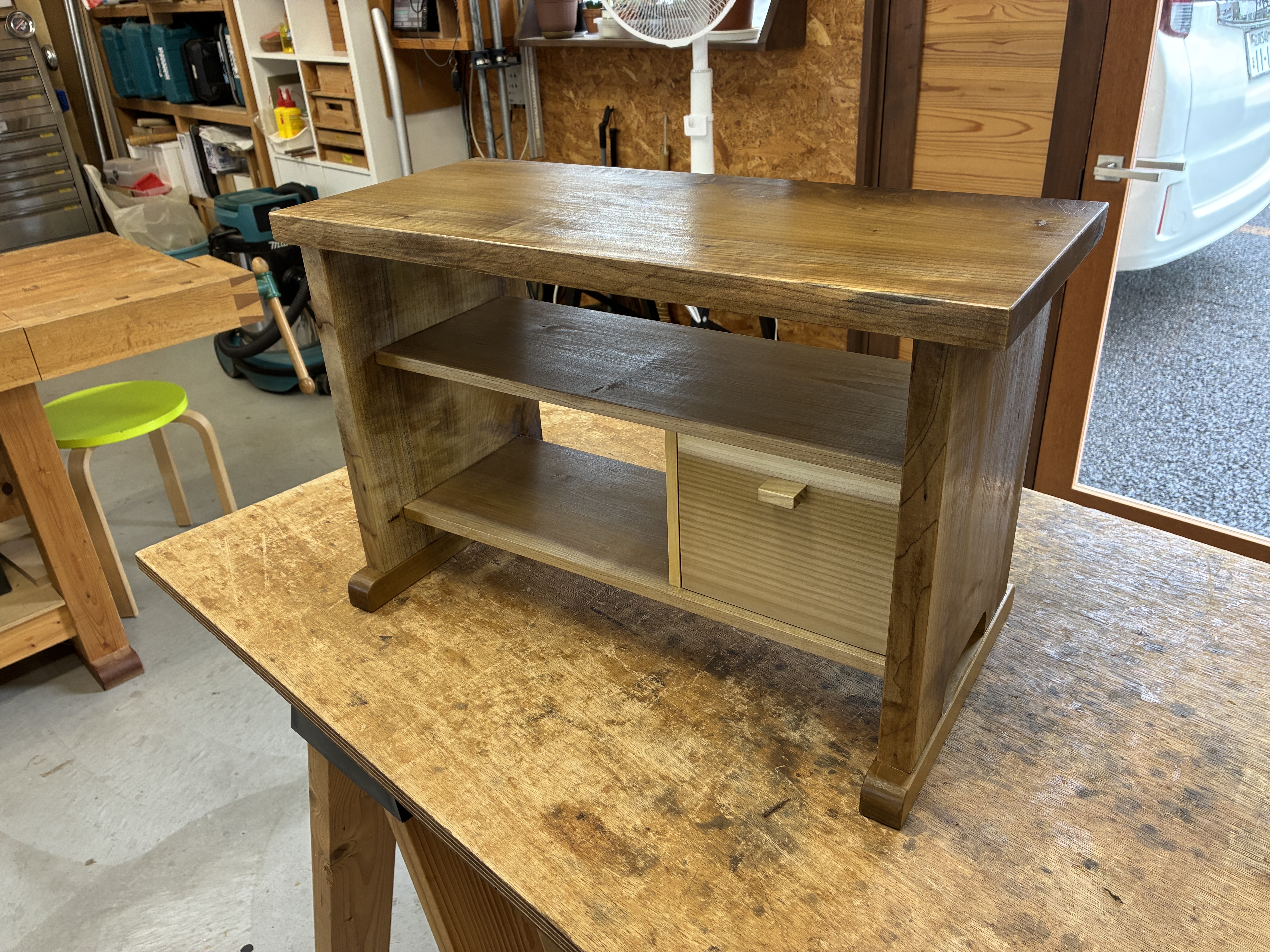 え~っと、テレビ台だったかな? 箱部分はあられ組、脚は割り楔を入れた丸ほぞでがっちり旋盤削り出しの丸脚を固定されてます。