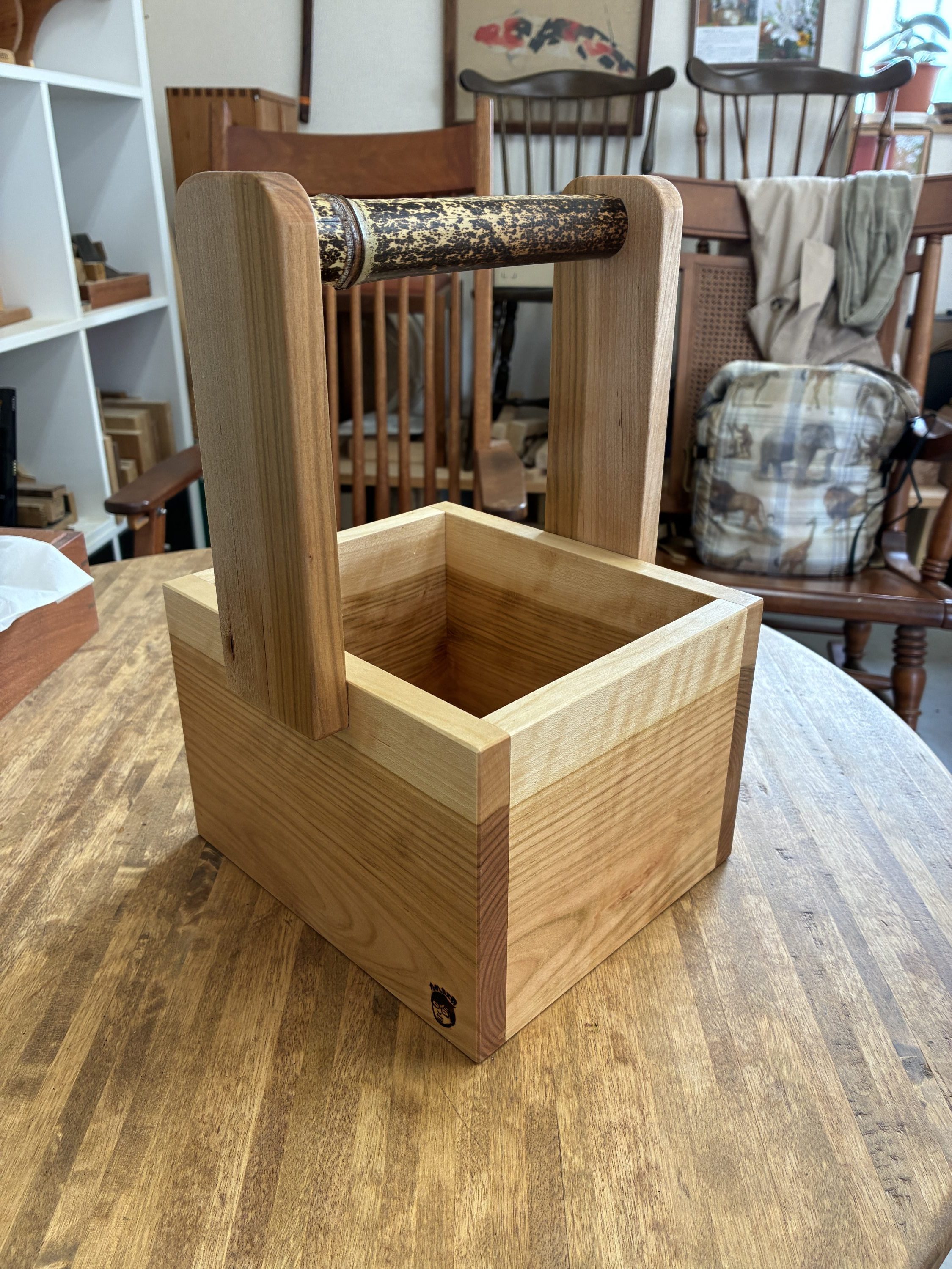 最初は手ごろな大きさの岡持ちと呼ばれる持ち運び用の容器。取っ手が渋い黒竹です。