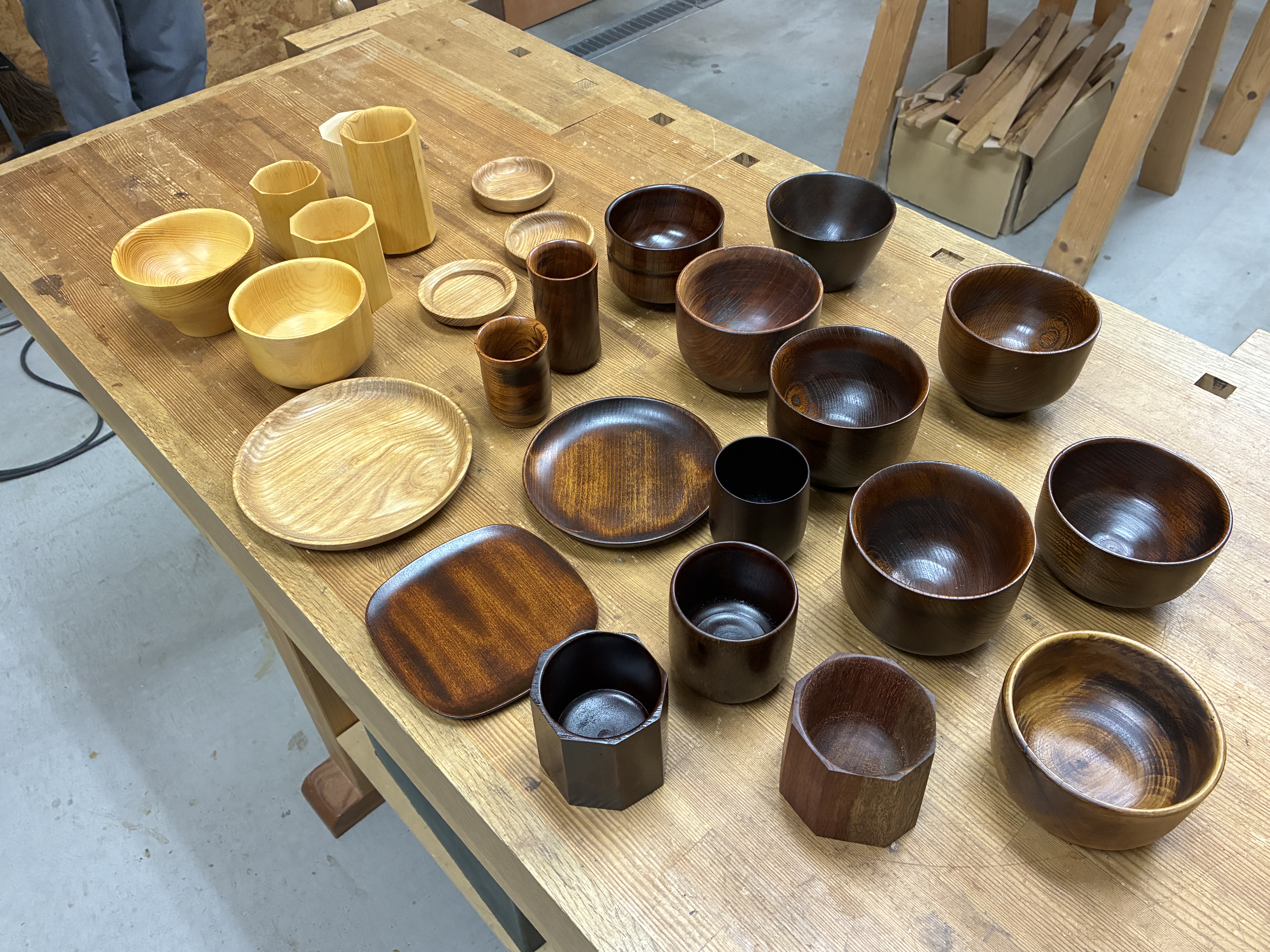 7.この半年ほど旋盤での器作りに専心されていたTAさん。器だけでなく漆塗りにも邁進中! 並べてみてご本人もびっくりのすごい数の器が出来上がりました。お皿にお椀、湯呑にぐい飲み、小物入れ。手前の色が濃いものは拭き漆を重ねて美しくも丈夫な器。木の色のものはオイル塗装やガラス塗料も試されてます。材もケヤキにタモ、栃にカヤと多岐にわたります。商売できそう!