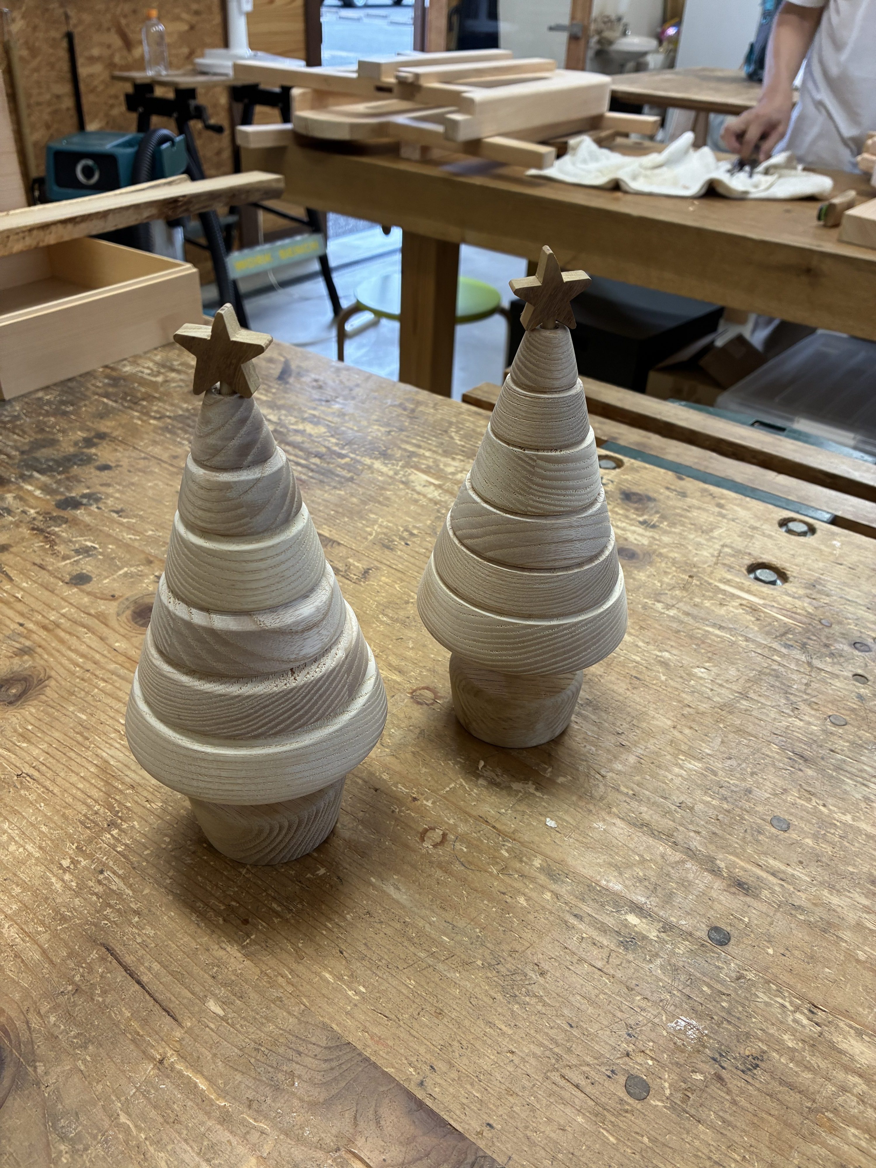 6.こちらも優しい表情の家具を次々お作りのTRさん。クリスマスの半年ほど前に余裕をもって完成したツリーです・高さ15cmほどのかわいいサイズを旋盤で作られました。