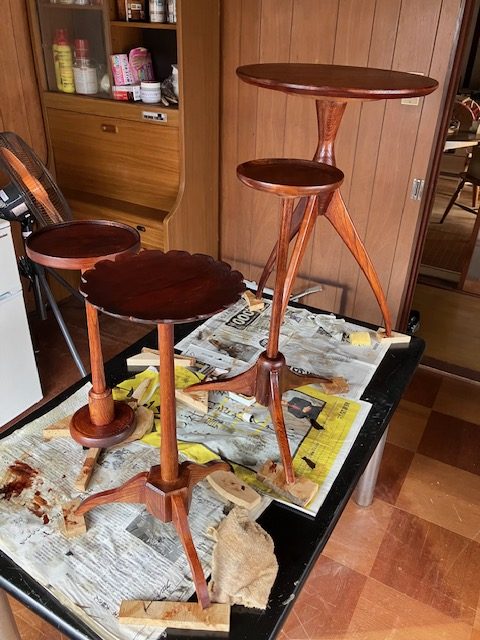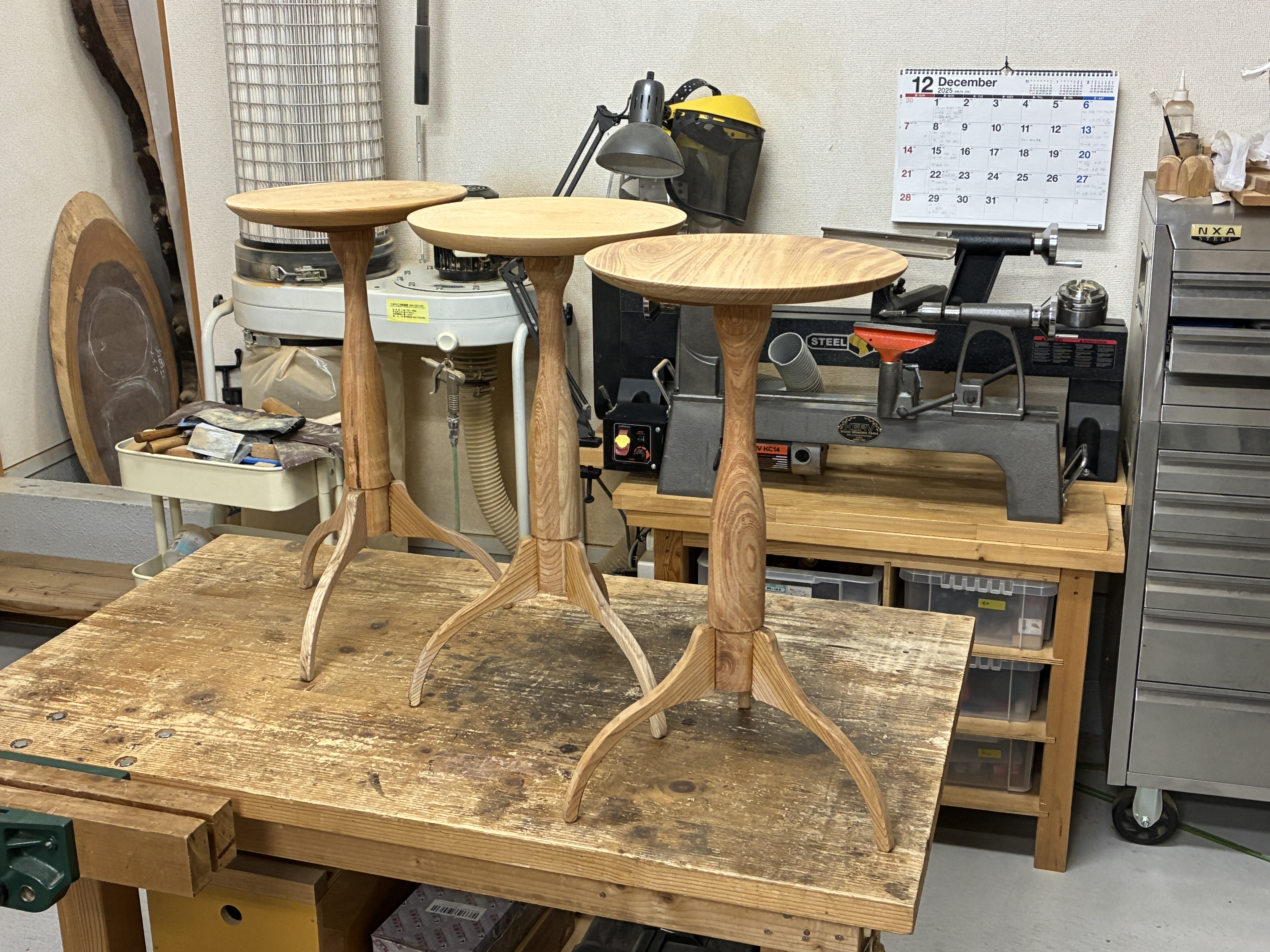 彼はシェーカー家具のキャンドルスタンドにも魅せられていてこれまでに10セット近く作られたのでは? 今回は一気に3セット同時完成です。後ろにある旋盤でセンター脚や天板加工をされました。