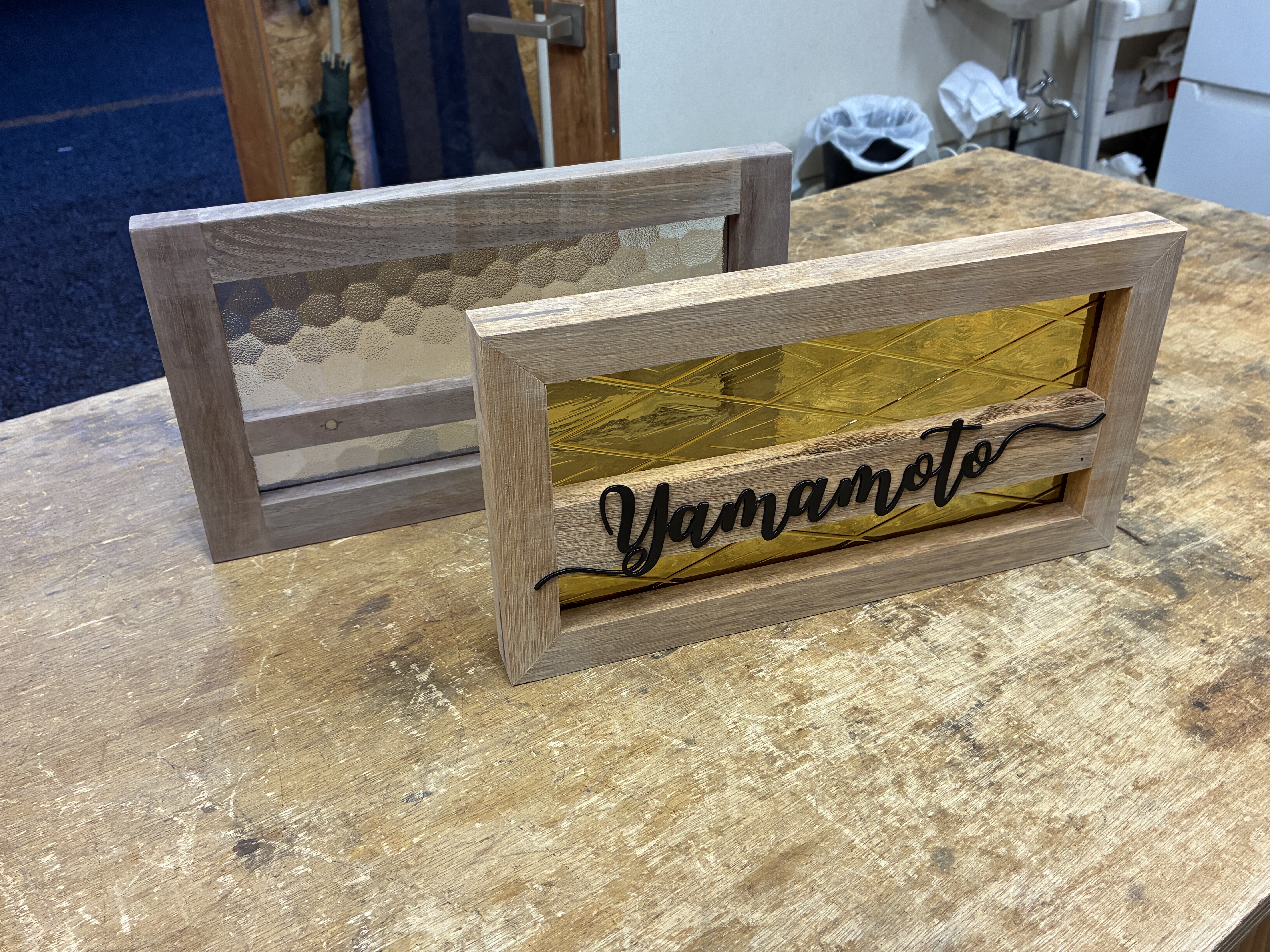 4.ご自宅のいろいろな場所を自作のオリジナル木工品で次々置き換えつつあるYYさん。お自宅の表札をおしゃれなものにされました。ウォルナットとサペリ(多分)の木を使い色ガラスが背景に入っています。気分で付け替えるのだとか。文字部分は磁石で付け替えられます。