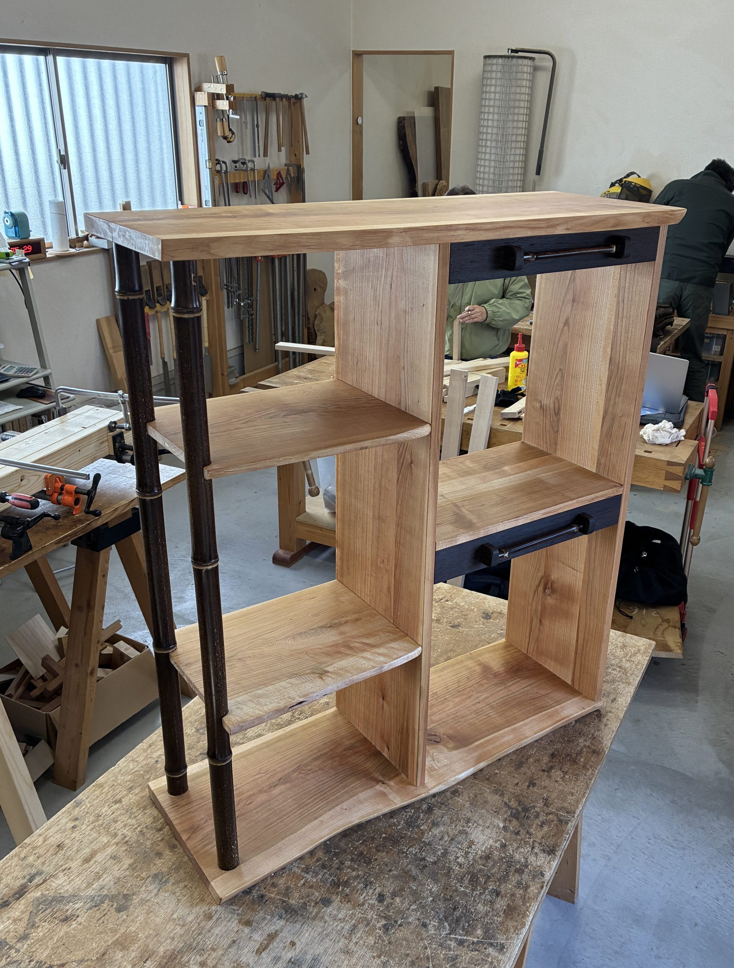 同じく黒竹の支柱を備えた和風の棚。薄い吊り引き出しがふたつあり、その取っ手も細い黒竹というこだわりの作品です。
