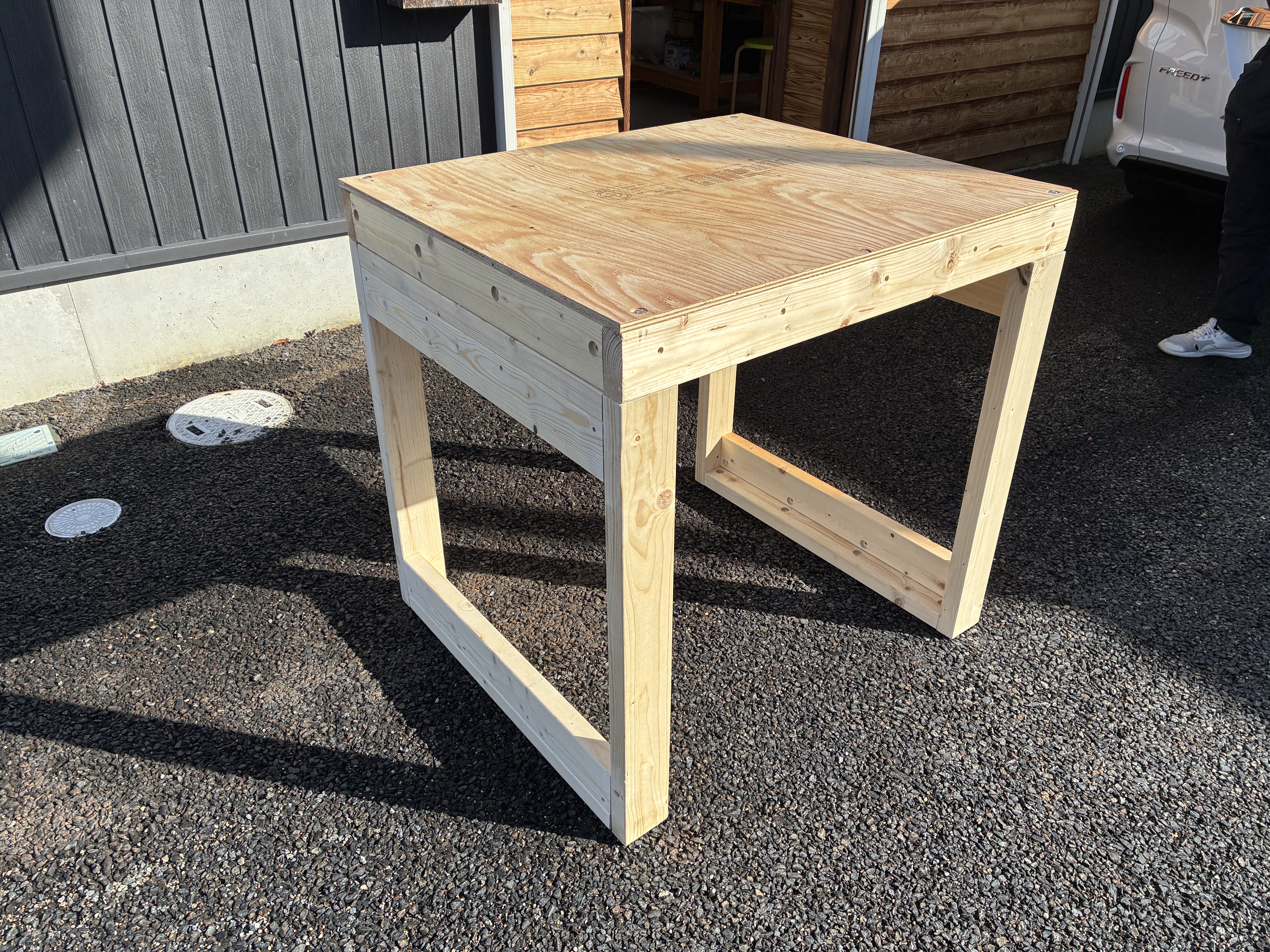 2.毎週、京都から途中越えで琵琶湖大橋を渡って通われているKTさんの作業台。ツーバイフォー材を用いて組み立て式になっています。同じ構造の脚部材と天板支持材を使って3個で組むと小さめの作業台、天板ふたつを接合すると倍サイズの巨大作業台にも変身。年明けにもしかしたら万力が取り付けられるかもしれません。