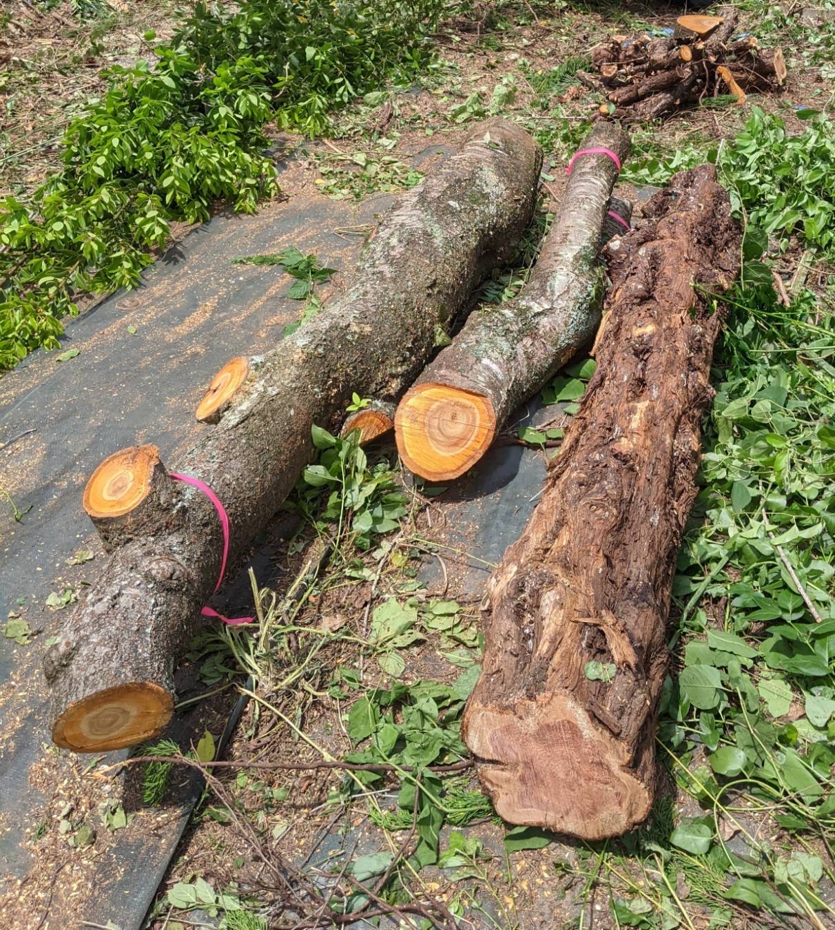 切り倒した際の丸太。製材所に持ち込んで板材に挽いてもらったそうです。桜の外にも貝塚伊吹も。数年間の乾燥で板が強烈に反ったり捻じれたりして平らな板にするだけでも大変でした。