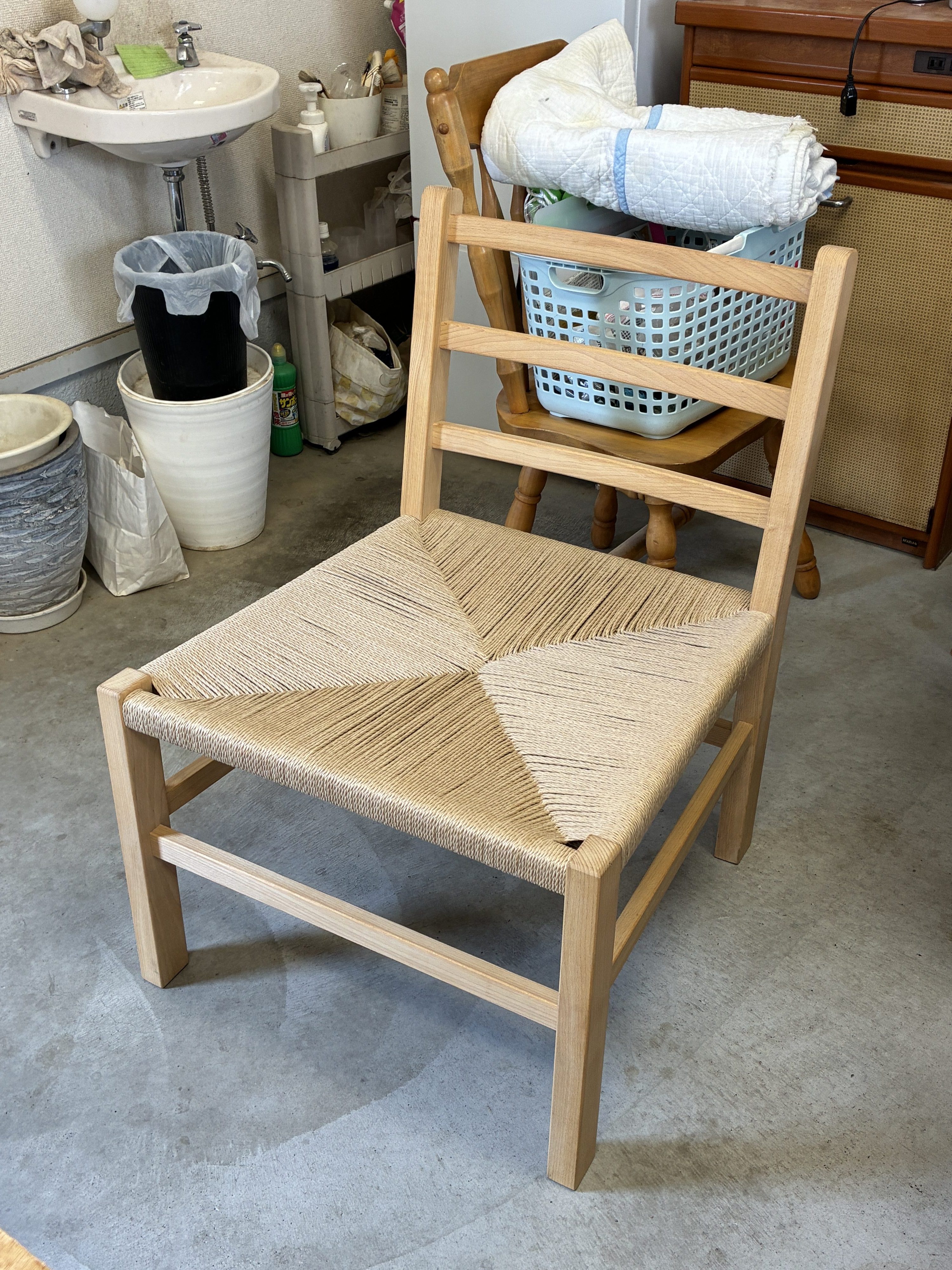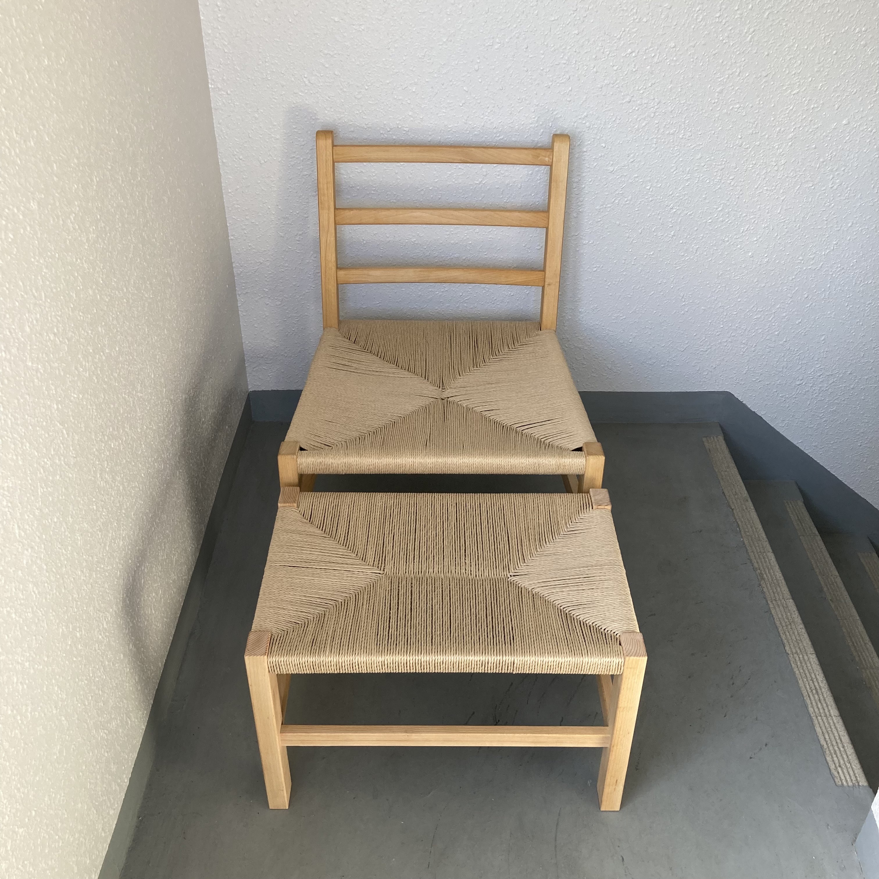 大き目のゆったりとしたサイズの椅子はブナ材を使った端正な作品。ペーパーコードを使って座面を編まれました。ペーパーコードが少し余ったこともありこの椅子に合わせて足置き(オットマン)も作られました。