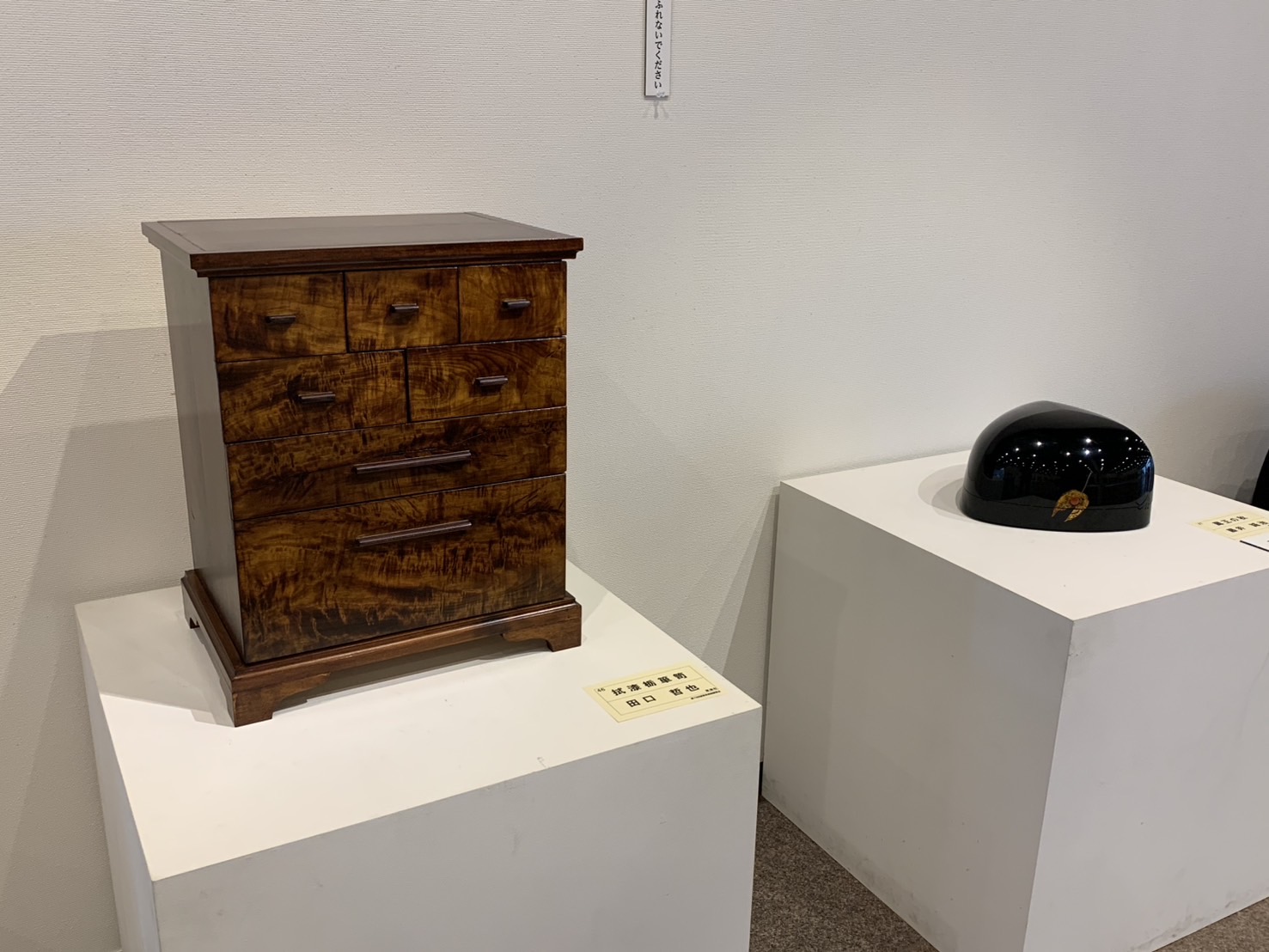 10.自前の工房もお持ちのTTさんは、教室の時間外でも製作が進むのでものすごい数の家具が生まれてきます。彼は2年前から滋賀県展にも出品されていて今年で3年連続入選を勝ち取られました。前回の作品紹介で掲載した小ダンスが25年秋の県展入賞作です(下記左)。引き出し前板は工房で提供した栃を使い拭き漆を重ねられています。専用の作品台に乗せられ堂々たる展示でした。ちなみにその右に陳列されているのは時々このブログにも登場の漆作家・藤井さんの乾漆の器。彼は滋賀県第一期のアートマスターでもあります。