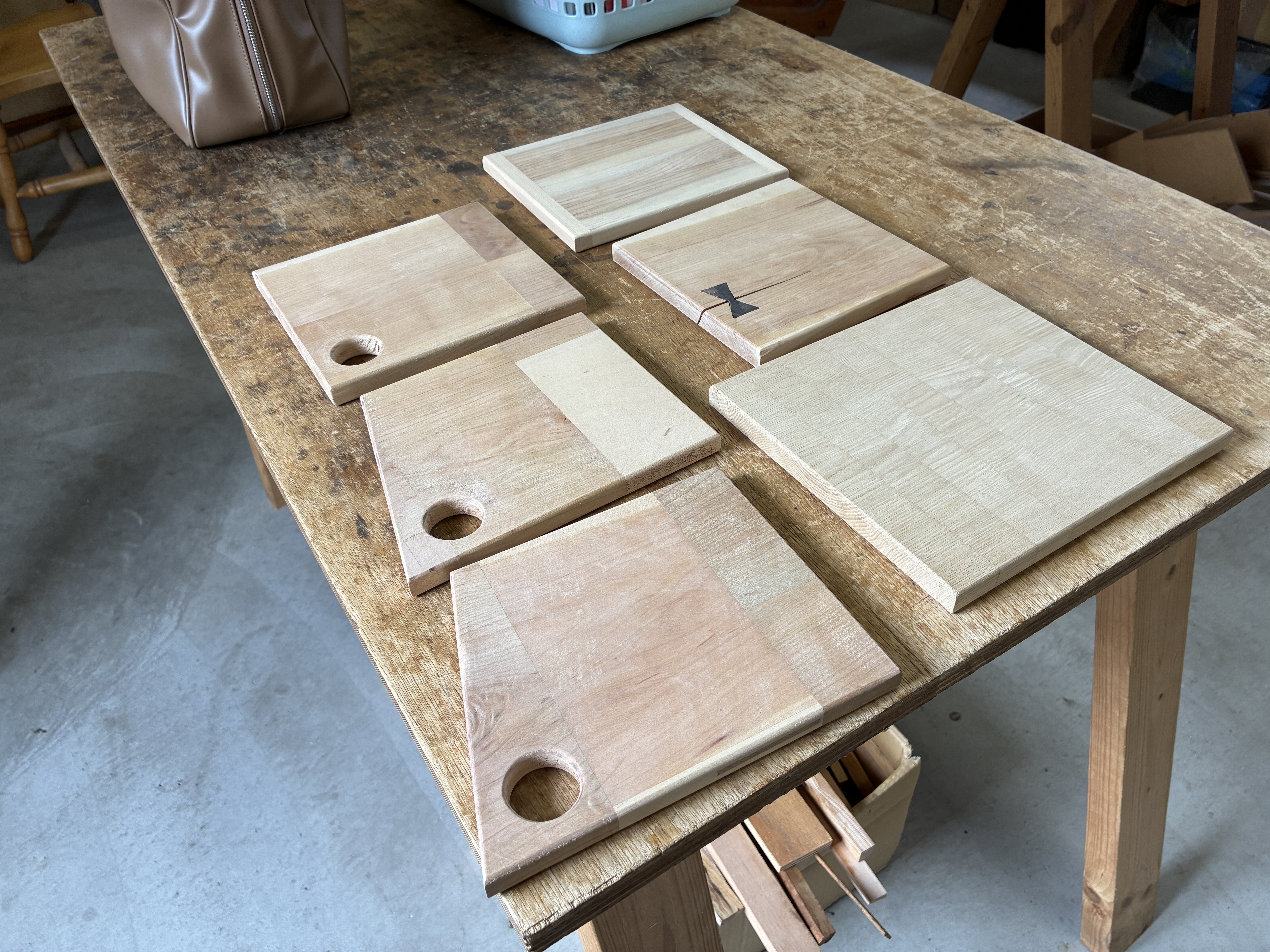 家具で使った残り板を有効活用した各種カッティングボード。沢山出来たのでプレゼント用かな?