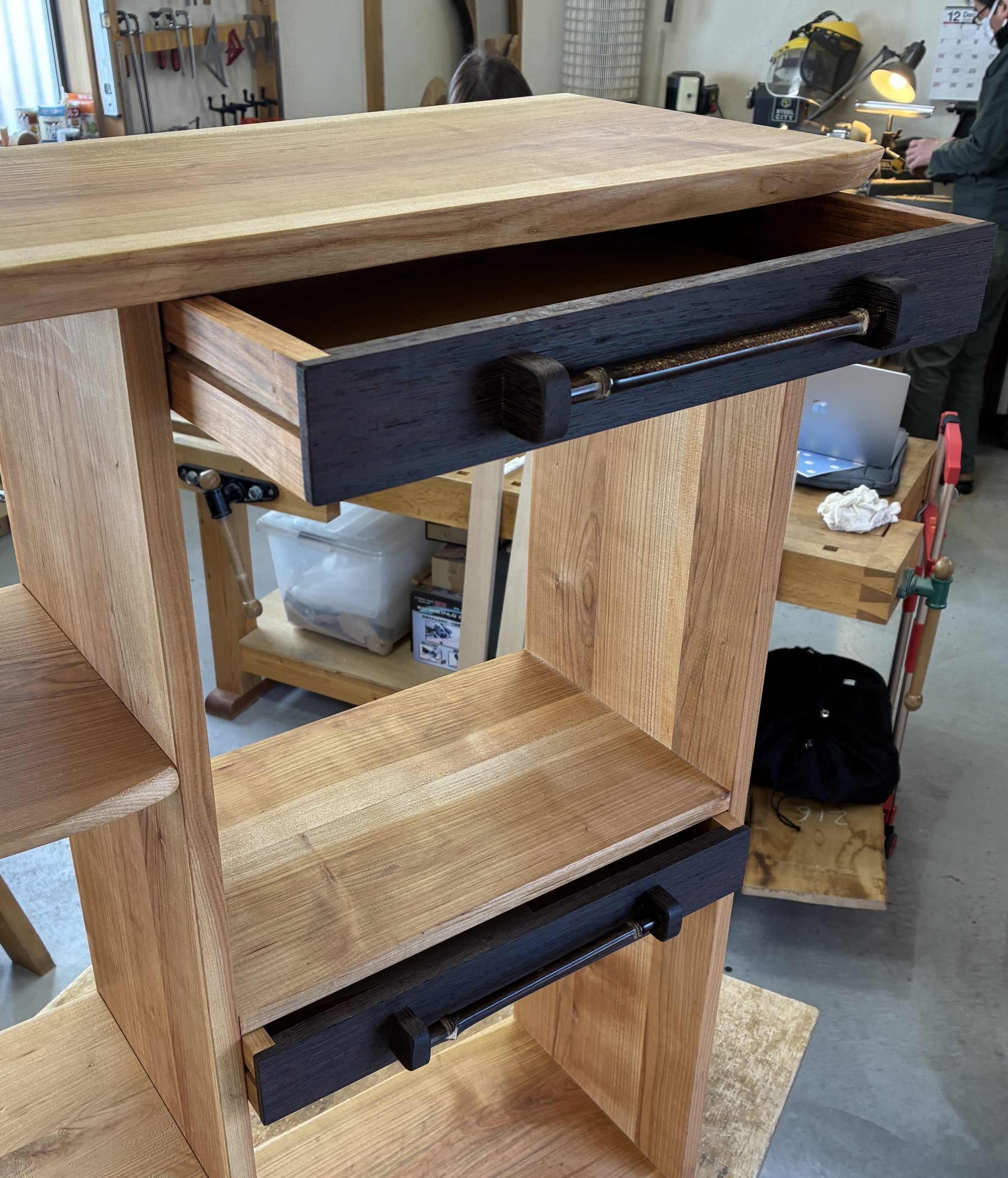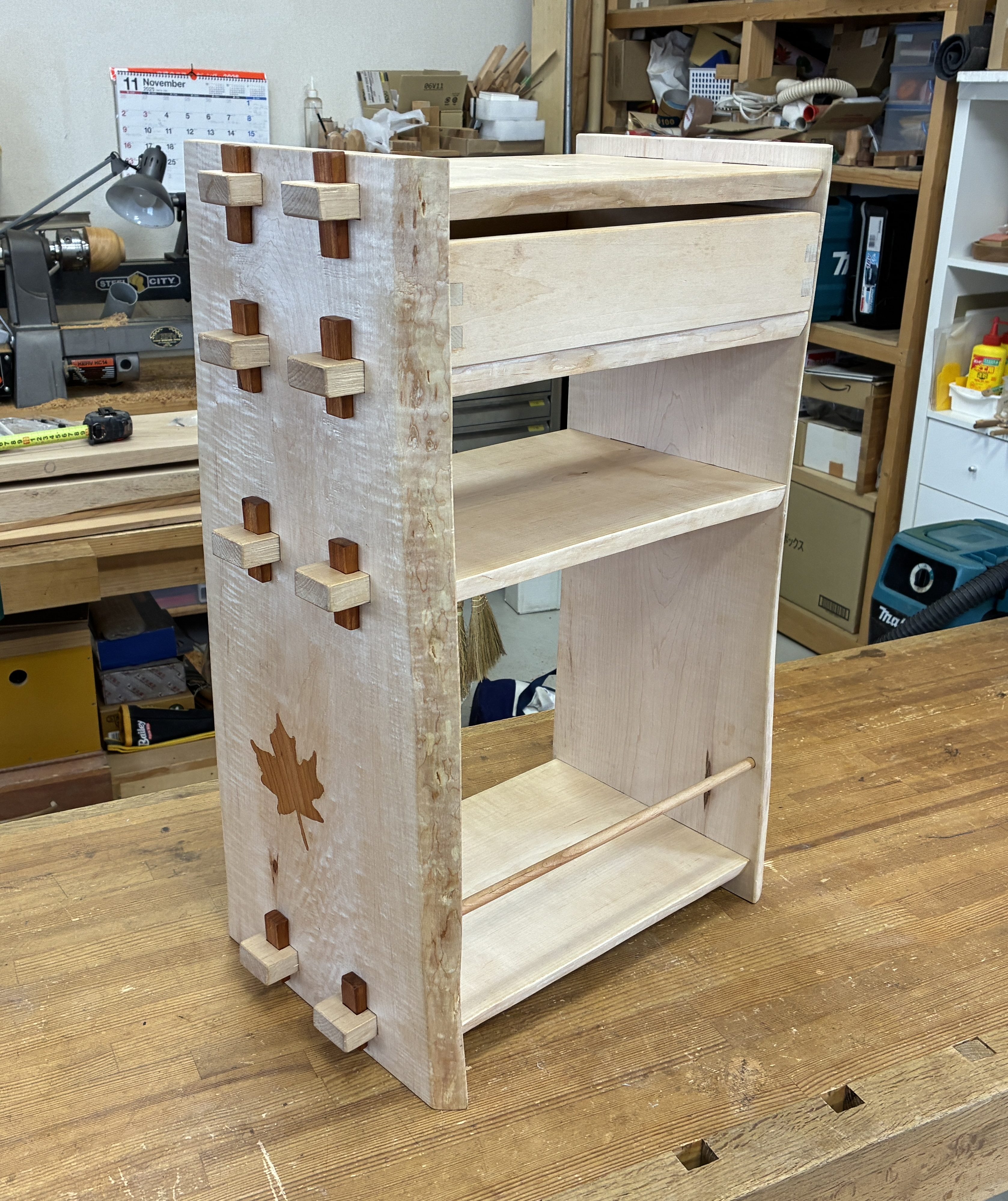 下は、これらの自作工具も活用して作られたイタヤカエデの棚。ご自宅の食卓下に収まる寸法になってます。棚板は接着剤を使わず通しほぞで側板に差し込み、くさびを叩き込んで固定するというふた手間かけた力作です。更に側板には楓の葉の形の象嵌が。これを埋め込むだけでも大変な手間が掛かっています。