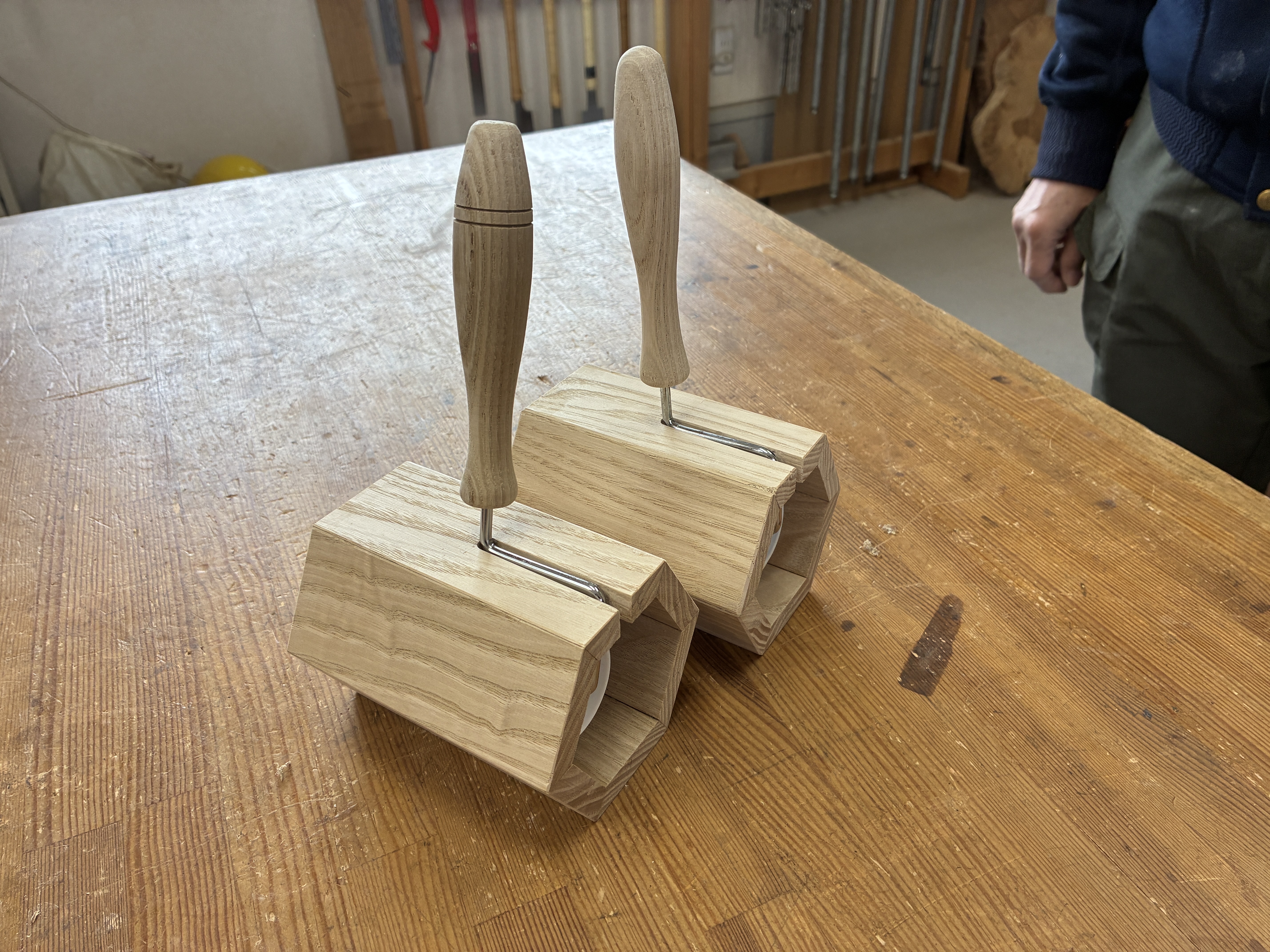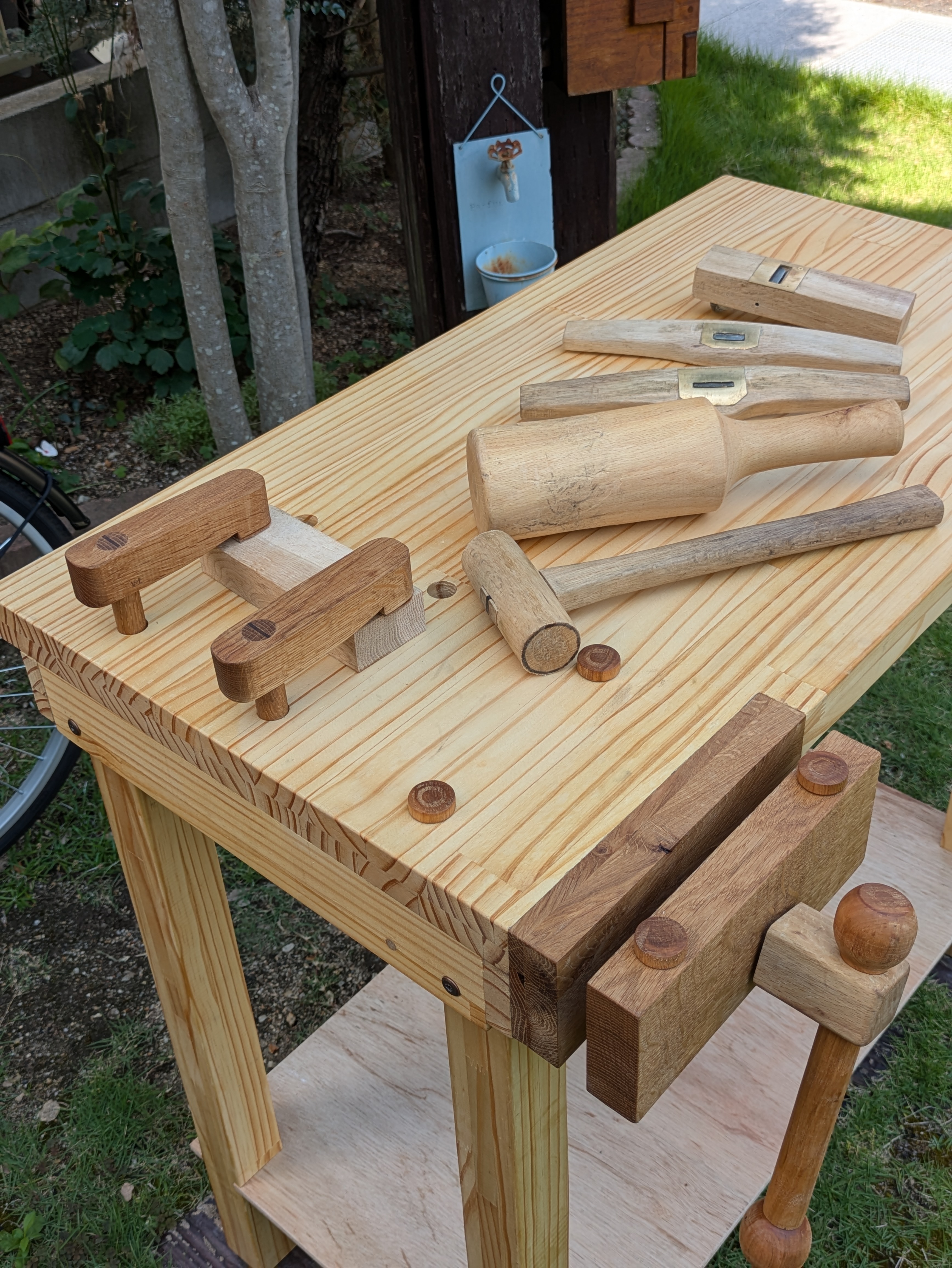 3.同じく作業台を作られたTMさん。この作業台には自作の万力も取り付けてられてます。長いボルトを切り、別の板付きナットと組み合わせてゼロから万力も作られました。更に驚くのは収納時に場所を取らぬよう脚を全部外して天板下に収納し作業台の棚板で蓋をしたうえ、移動用のキャスターも備えたカラクリ作業台であること。作業台の上には木槌、マレット(西洋式木槌)、南京鉋、小型平鉋などが並んでいますが、すべて自作の工具です。鉋の小さな刃は、大きな鉋の刃を金鋸で切りやすりを掛けて薄く改造した刃が使われてます。大変な労作です。作業台に材を固定する逆L字型の道具(Holdfast)も自作! 板を挟んで丸軸部を天板の穴に差し込んで木槌で叩くだけでがっちりと天板に固定できるのです。