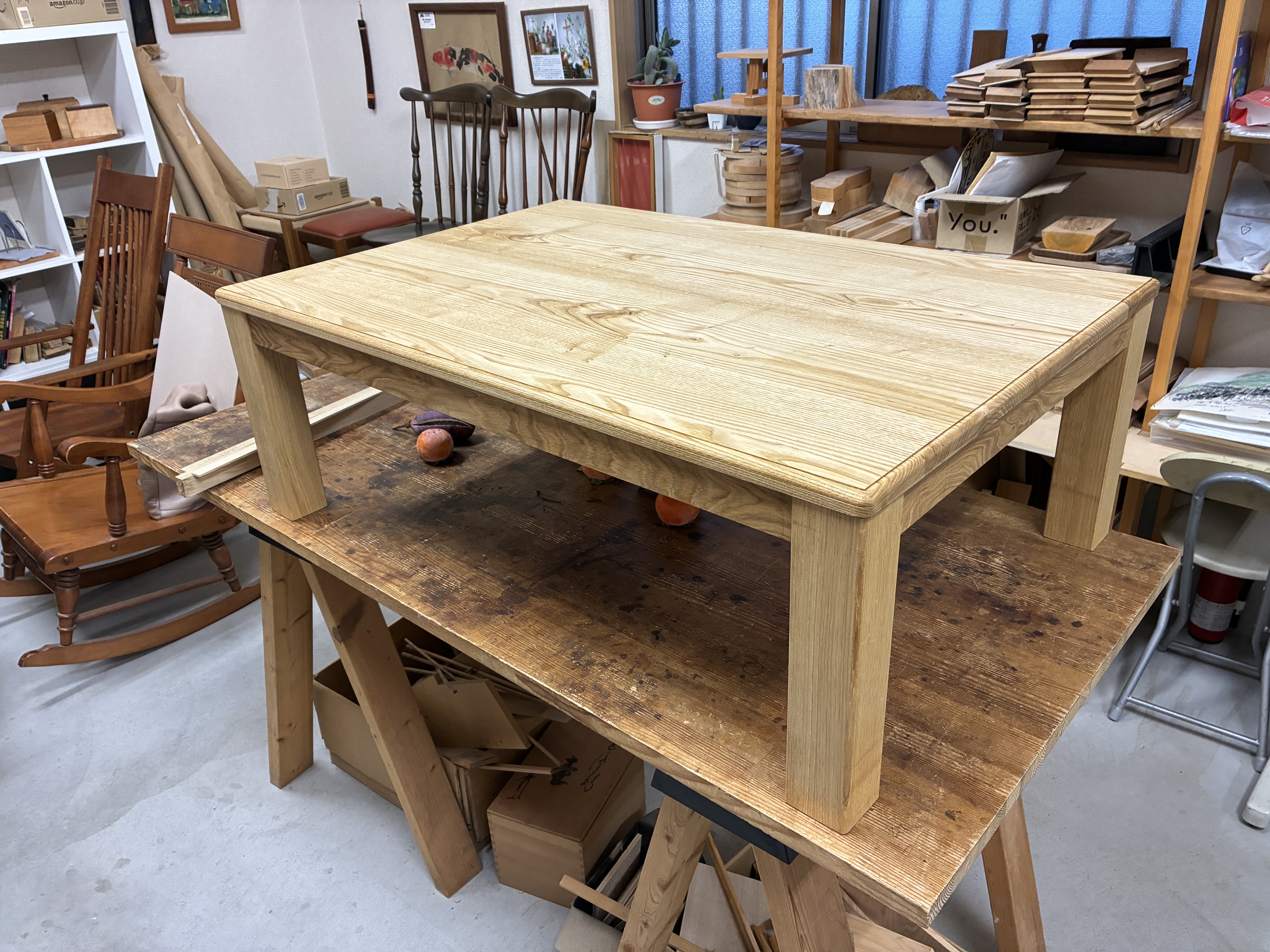 そして大作の栗のコタツです。以前使われていたコタツから外したヒーターを取り付け、天板も厚くてがっしりとしています。夏場はコタツ布団を外すのでダボを差し込んで天板がずれない工夫もされてます。