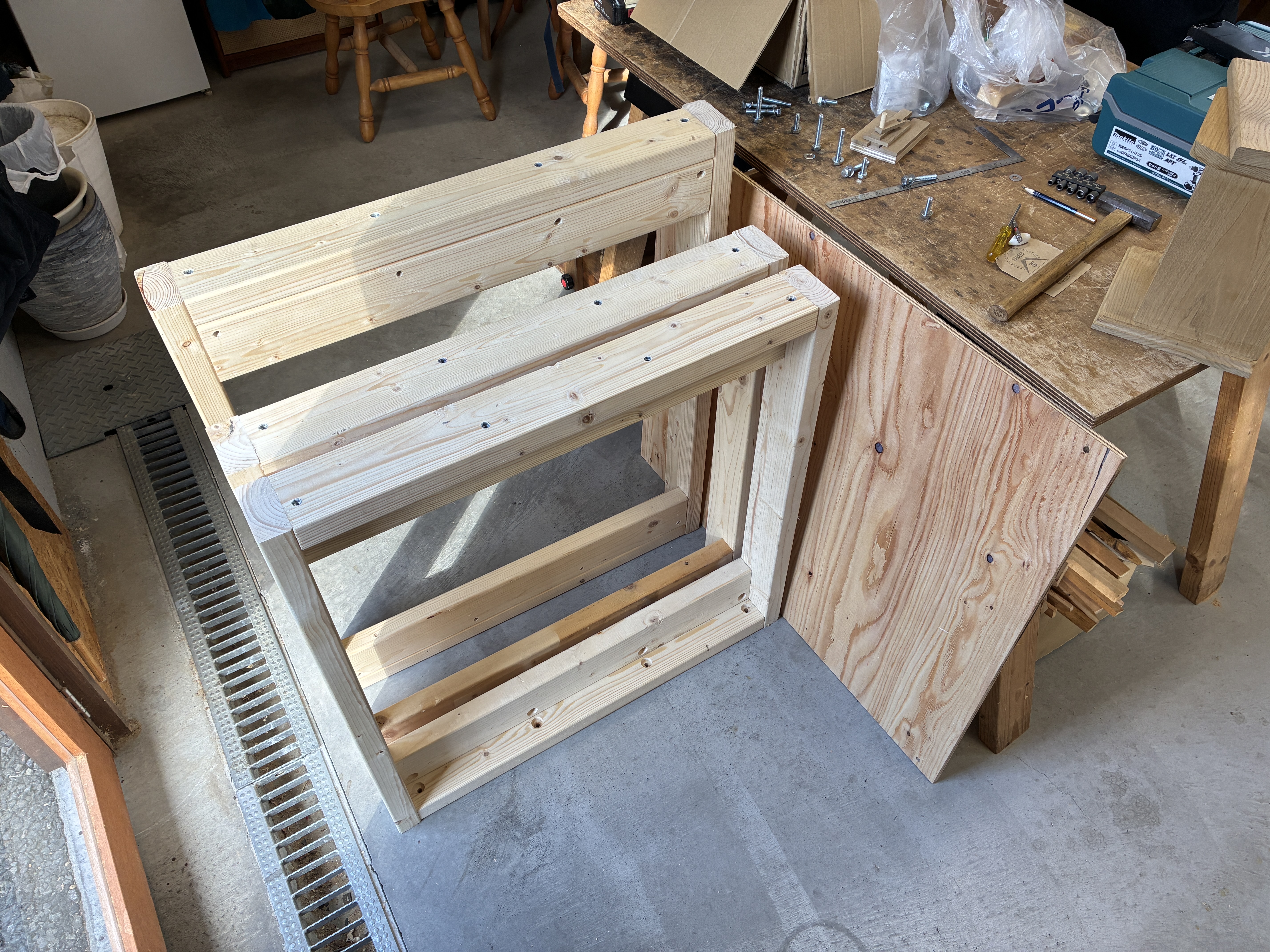 2.毎週、京都から途中越えで琵琶湖大橋を渡って通われているKTさんの作業台。ツーバイフォー材を用いて組み立て式になっています。同じ構造の脚部材と天板支持材を使って3個で組むと小さめの作業台、天板ふたつを接合すると倍サイズの巨大作業台にも変身。年明けにもしかしたら万力が取り付けられるかもしれません。