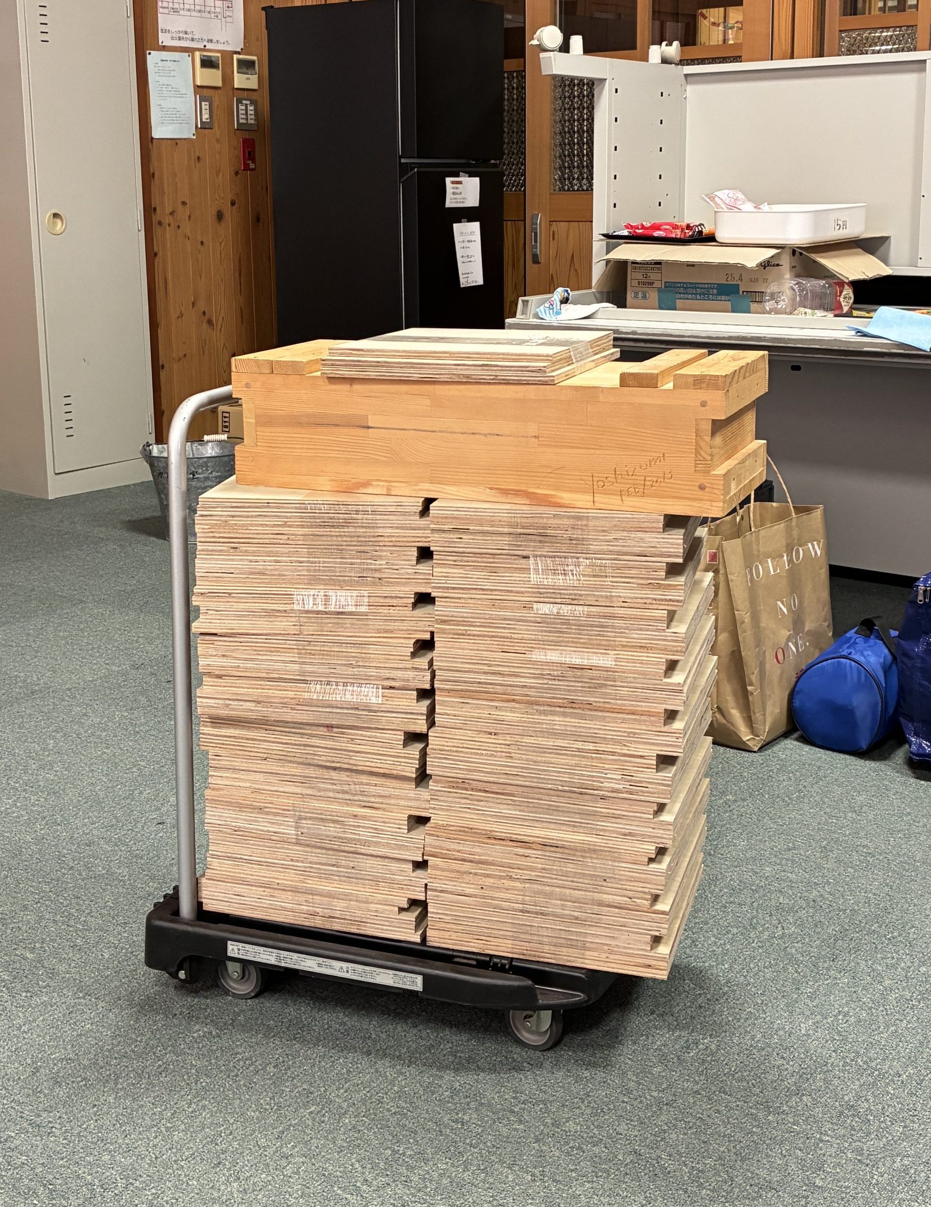 親しい知人が夏休み期間中の学童保育に関わっておられ3時間程度で子供たちに箱作りの指導をしてほしいと依頼がありました。保育スタッフ分も入れると20人以上になるので同時に進める教室として過去最多です。ベニヤ板で箱作りをしてもらうことになり、できる限り無駄のない寸法を計算して材料カット。一人分5枚ごとにセットして会場となった隣町の小学校に台車で運び入れました。簡単な説明を行ったのちチーム単位で製作スタートです。