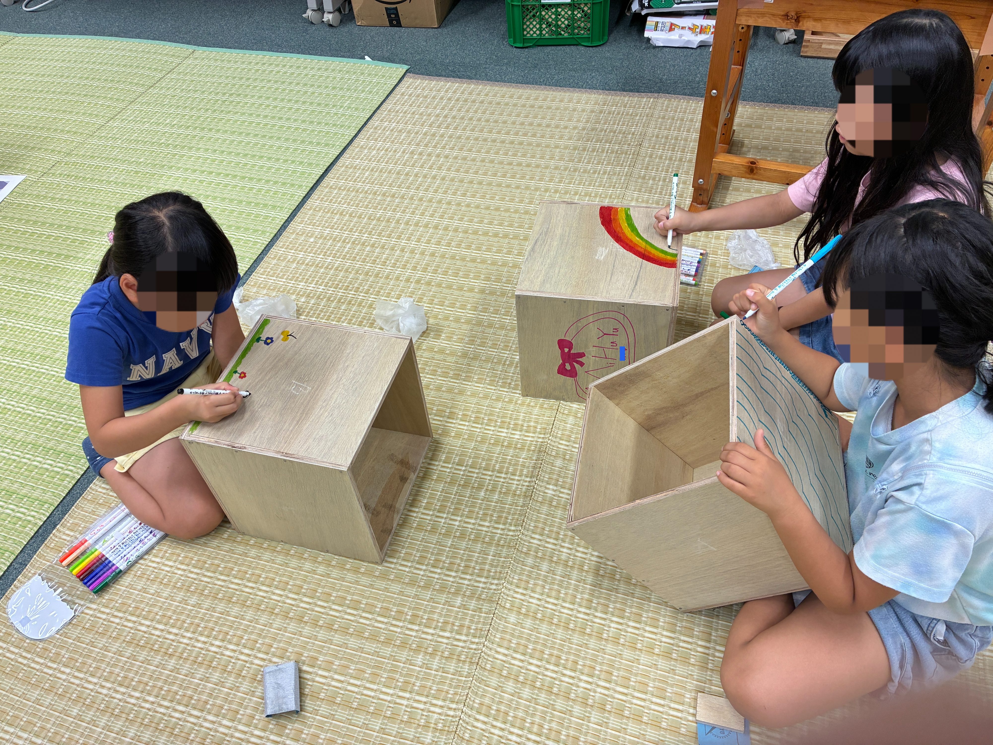 女の子たちチームでは先に組み上げて、ペンや好きな絵を側面に描く余裕まで。という訳で予定時間で全員箱を完成させる事が出来ました、よかったよかった!慌ただしくも楽しい経験をさせてもらいました。