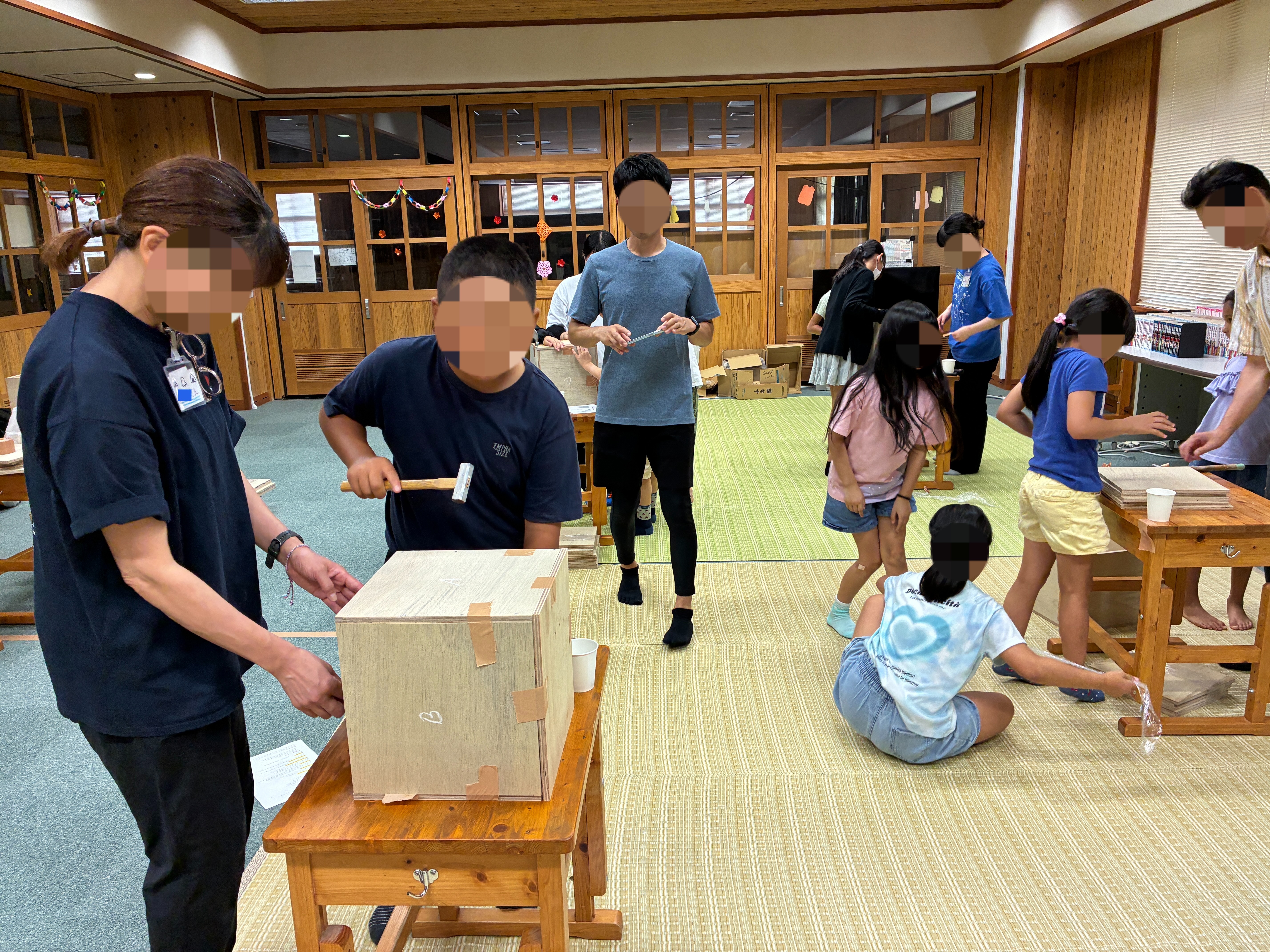 5枚の板を接着するか金具を使うか少し悩みましたが、接着するのは少しハードルが高いので釘打ちで組んでもらうことにしました。工房の金槌だけでは足りないのでスタッフの方にも持ち寄ってもらいました。チームごとにお互い手伝いながらガムテープで仮固定してから釘を打ってもらいます。さっさと器用に進めるチームやゆっくり丁寧にやるチームとそれぞれ。